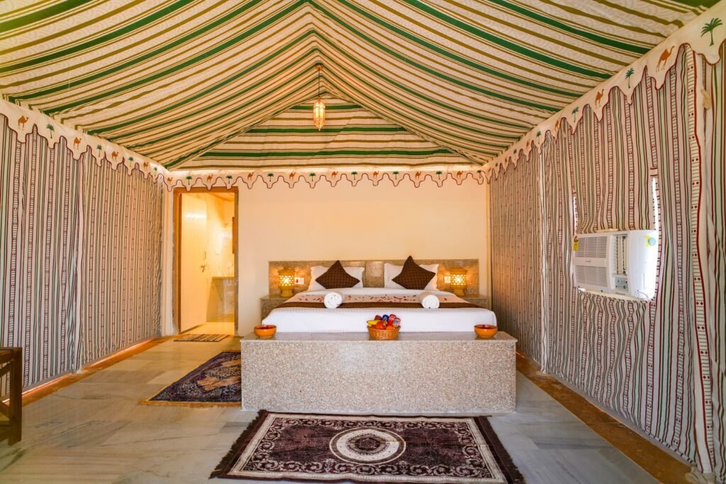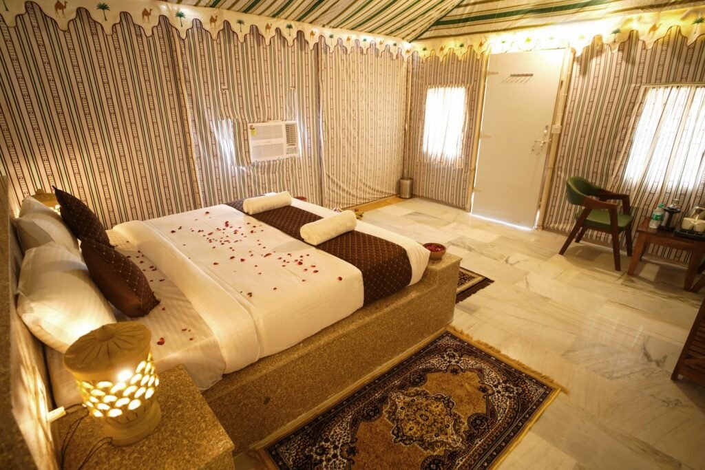 Spacious Luxury Swiss Tents with attached bathrooms & Peaceful ambiance under the starlit desert sky.